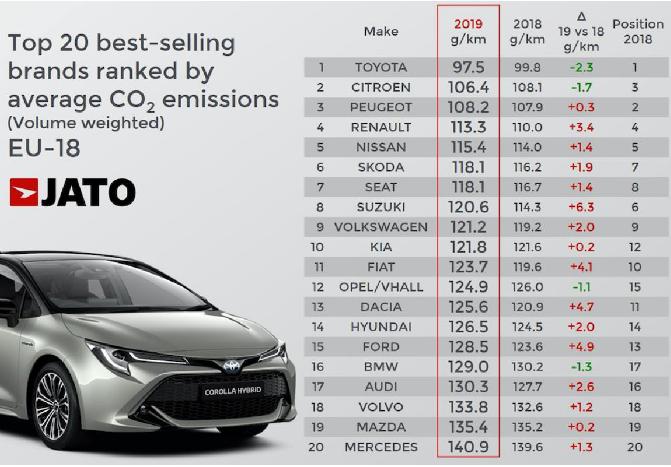 Η Toyota διατηρεί τη θέση της ως κορυφαία ανάμεσα στις 20 μεγαλύτερες σε πωλήσεις μάρκες με το χαμηλότερο μέσο όρο εκπομπών CO2 στην Ευρώπη. Παράλληλα με αυτό, ο Ιάπωνας κατασκευαστής είδε επίσης τη μεγαλύτερη μείωση από το 2018, με το μέσο όρο του να πέφτει κατά 2.3 g/km. Η επιτυχία της Toyota βασίζεται σε μεγάλο βαθμό στη δημοφιλή υβριδική γκάμα της, με ταξινομήσεις που αντιπροσωπεύουν το 60% του συνολικού όγκου της μάρκας το 2019. Ο κ.Munoz δήλωσε: “Η Toyota είναι μια κατάλληλη περίπτωση, δεδομένου ότι δεν προσφέρει αμιγώς ηλεκτρικά αυτοκίνητα, αλλά βρίσκεται μπροστά από τους ευρωπαίους ομότιμούς της οι οποίοι εξακολουθούν να διαθέτουν περισσότερα σχέδια ηλεκτροκίνησης από πραγματικά προϊόντα.”