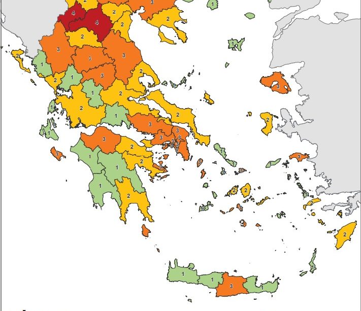 - Σε επίπεδο 4-αυξημένου κινδύνου τίθεται η Περιφερειακή Ενότητα Καστοριάς.