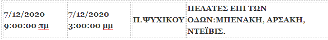 | 7/12/2020 9:00:00 πμ | 7/12/2020 3:00:00 μμ | Π.ΨΥΧΙΚΟΥ | ΠΕΛΑΤΕΣ ΕΠΙ ΤΩΝ ΟΔΩΝ:ΜΠΕΝΑΚΗ, ΑΡΣΑΚΗ, ΝΤΕΪΒΙΣ. | 852 | Συντήρηση |