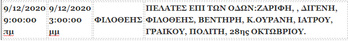 | 9/12/2020 9:00:00 πμ | 9/12/2020 3:00:00 μμ | ΦΙΛΟΘΕΗΣ | ΠΕΛΑΤΕΣ ΕΠΙ ΤΩΝ ΟΔΩΝ:ΖΑΡΙΦΗ, , ΔΙΓΕΝΗ, ΦΙΛΟΘΕΗΣ, ΒΕΝΤΗΡΗ, Κ.ΟΥΡΑΝΗ, ΙΑΤΡΟΥ, ΓΡΑΙΚΟΥ, ΠΟΛΙΤΗ, 28ης ΟΚΤΩΒΡΙΟΥ. | 857 | Συντήρηση |