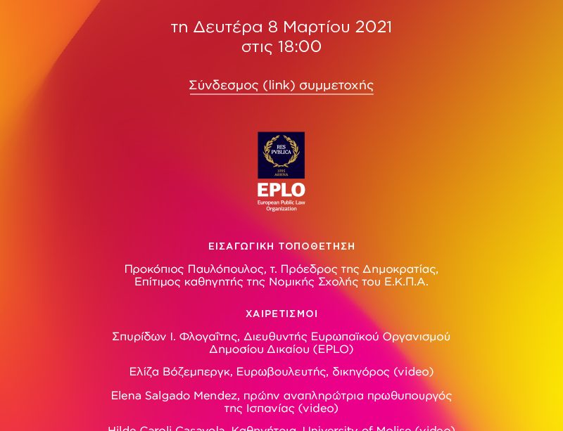 Θα ακολουθήσουν χαιρετισμοί από τον κ. Σπυρίδωνα Φλογαϊτη, Διευθυντή του Ευρωπαϊκού Οργανισμού Δημοσίου Δικαίου (EPLO), την κ. Ελίζα Βόζεμπεργκ, ευρωβουλευτή και δικηγόρο (video), την κα Elena Salgado Mendez πρ. αναπληρώτρια πρωθυπουργό της Ισπανίας (video), την καθηγήτρια Hilde Caroli Casavola University of Molise (video).