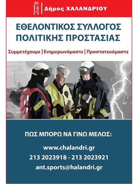 Ο Δήμος Χαλανδρίου στηρίζει τη δημιουργία Εθελοντικού Συλλόγου Πολιτικής Προστασίας, ο οποίος θα δραστηριοποιηθεί στην άμεση αντιμετώπιση των φυσικών και τεχνολογικών καταστροφών, στην ευαισθητοποίηση του κοινού και την δημιουργία οικολογικής συνείδησης στις νεότερες γενιές, στην αρωγή προς τους πληγέντες συνανθρώπους μας μετά από κάθε φυσική ή μη καταστροφή και στην προστασία της ζωής και των περιουσιών μας, σε περιπτώσεις πυρκαγιών, πλημμυρών, σεισμών, δυστυχημάτων, χιονοπτώσεων κοκ.