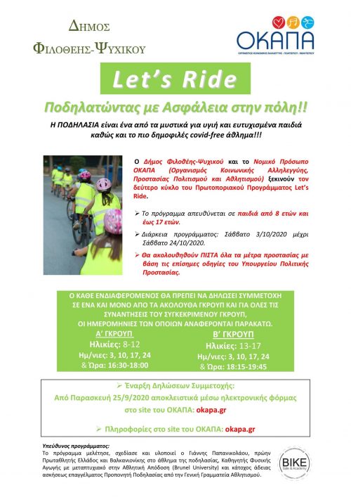 Ο Δήμος Φιλοθέης-Ψυχικού και το Νομικό Πρόσωπο ΟΚΑΠΑ (Οργανισμός Κοινωνικής Αλληλεγγύης, Προστασίας Πολιτισμού και Αθλητισμού) ξεκινούν τον δεύτερο κύκλο του Πρωτοποριακού Προγράμματος Let’s Ride, μετά από αίτημα των γονέων και την μεγάλη επιτυχία του πρώτου κύκλου που έγινε τον περασμένο Ιούλιο.