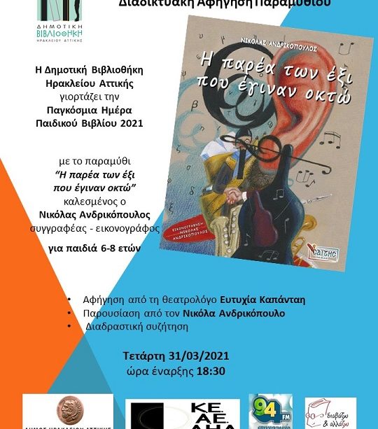 Διαδικτυακή αφήγηση του παραμυθιού «Η παρέα των έξι που έγιναν οκτώ» προγραμματίζει η Δημοτική Βιβλιοθήκη Ηρακλείου Αττικής για να γιορτάσει την Παγκόσμια Ημέρα Παιδικού Βιβλίου.