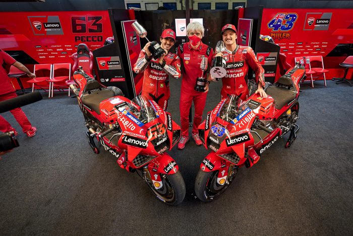 Με το μέγιστο των 45 βαθμών έφυγε από την Ισπανία και την πίστα της Χερέθ, νωρίτερα σήμερα το απόγευμα, η Ducati Lenovo Team. Ο Αυστραλός Jack Miller και ο Ιταλός Francesco–Pecco–Bagnaia, κατέκτησαν την 1η και 2η θέση αντίστοιχα στο Grand Prix της Ισπανίας, μετά από παλικαρίσιο αγώνα με τις δύο Ducati Desmosedici. Μάλιστα, για τον μεν Αυστραλό αυτή ήταν η μόλις δεύτερη νίκη στην καριέρα του ενώ για τον δε Ιταλό, το αποτέλεσμα αυτό τον φέρνει στην πρωτοπορία του πρωταθλήματος αναβατών, μετά από τέσσερις αγώνες.
