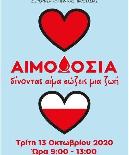 Ο Δήμος Φιλοθέης Ψυχικού και η Διεύθυνση Κοινωνικής Προστασίας, διοργανώνει Εθελοντική Αιμοδοσία, την Τρίτη 13 Οκτωβρίου 2020 (09.00 – 13.00) στο Αθλητικό Κέντρο Νέου Ψυχικού, σε συνεργασία με την κινητή μονάδα αίματος του Λαϊκού.