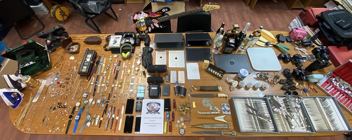 Βρέθηκαν και κατασχέθηκαν μεταξύ άλλων κοσμήματα, ασημικά, ρολόγια, επώνυμα δερμάτινα είδη, πλήθος ηλεκτρονικών συσκευών και φορητών ηλεκτρονικών υπολογιστών, μουσικά όργανα, αλκοολούχα ποτά, κινητά τηλέφωνα, αποδείξεις και κάρτες μεταφοράς χρημάτων, συναλλαγές με ενεχυροδανειστήρια, διαρρηκτικά εργαλεία, κλειδαριές, -2- επιχειρησιακά αυτοκίνητα και το χρηματικό ποσό των -6.220- ευρώ
