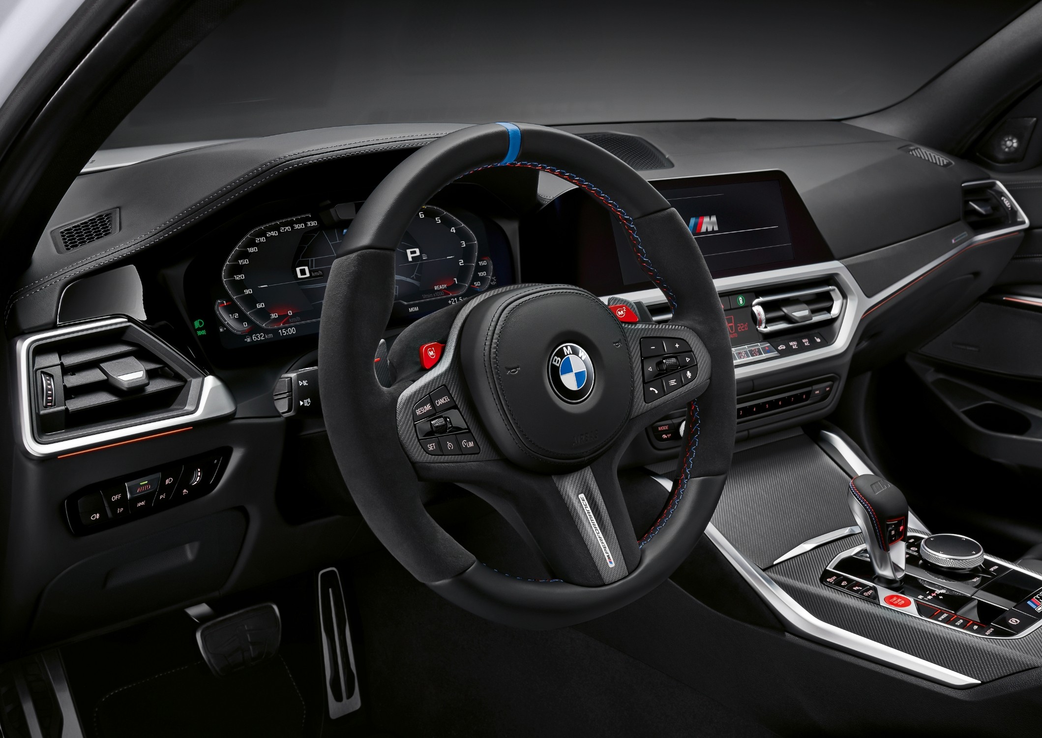 Οι πελάτες μπορούν να αναδείξουν περαιτέρω το σπορ χαρακτήρα και να βελτιώσουν το επίπεδο άνεσης στο εσωτερικό των BMW M3 Sedan ή BMW M4 Coupé τους ποικιλοτρόπως, οπτικά και λειτουργικά, χρησιμοποιώντας αξεσουάρ M Performance, εμπνευσμένα από το μηχανοκίνητο αθλητισμό. Μόλις ανοίγει η πόρτα, το κατώφλι με το ανθρακονημάτινο ένθετο M Performance και το έγχρωμο λογότυπο εκφράζει μία ανόθευτη αγωνιστική αίσθηση. Επιπλέον, χάρη στο λογότυπο M Performance, μία σημαία με χρώματα M και μπορντούρα από δερματίνη με ραφές σε εντυπωσιακά χρώματα, και τα ασορτί εμπρός και πίσω πατάκια της M Performance μεταφέρουν το δυναμικό εξωτερικό στυλ μέσα στο αυτοκίνητο. Τον ίδιο σκοπό εξυπηρετούν και τα ανθρακονημάτινα διακοσμητικά εσωτερικού της M Performance – ένα συναρπαστικό μίγμα ματ carbon με ανοιχτούς πόρους και κομψής επένδυσης Alcantara. Είναι χειροποίητα με την εφαρμογή μιας περίπλοκης διαδικασίας, επομένως το καθένα είναι μοναδικό στο είδος του. Επενδύσεις γονάτων Alcantara της M Performance στην κεντρική κονσόλα ολοκληρώνουν τη γκάμα αξεσουάρ εσωτερικού.