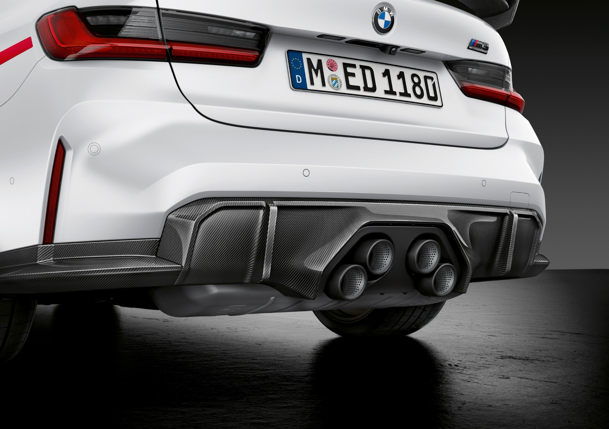 Την τελική εικόνα ολοκληρώνει ο πίσω διαχύτης από carbon σε συνδυασμό με το σύστημα σιλανσιέ από τιτάνιο και την πολλαπλή εξαγωγή από τιτάνιο με κεραμική επίστρωση και μαύρο ματ φινίρισμα – όλα προϊόντα της M Performance. Οι απολήξεις εξαγωγής από carbon/τιτάνιο της M Performance είναι μία ακόμα σπορ πρόταση για την εξατομίκευση του στάνταρ συστήματος εξάτμισης των BMW M3 Sedan και BMW M4 Coupé. Τα μοντέλα υψηλών επιδόσεων μπορούν να εξατομικεύονται ακόμα περισσότερο με τα διακοσμητικά αυτοκόλλητα της M Performance Motorsport. Το σετ περιλαμβάνει διακοσμητικές αυτοκόλλητες μεμβράνες για κάθε πλευρά στα τρία χρώματα της BMW M – μπλε, κόκκινο και βυσσινί – και είναι προσαρμοσμένες στη γεωμετρία του αυτοκινήτου.