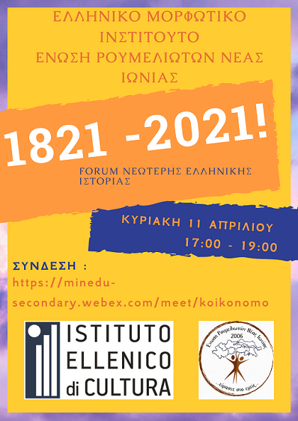 Σας καλωσορίζουμε στο Forum Νεώτερης Ελληνικής Ιστορίας που συνδιοργανώνουν το Ελληνικό Μορφωτικό Ινστιτούτο και η Ένωση Ρουμελιωτών Νέας Ιωνίας ως συμβολή στην απόδοση τιμής στην επέτειο των 200 ετών από την έναρξη της Ελληνικής Επανάστασης του 1821.