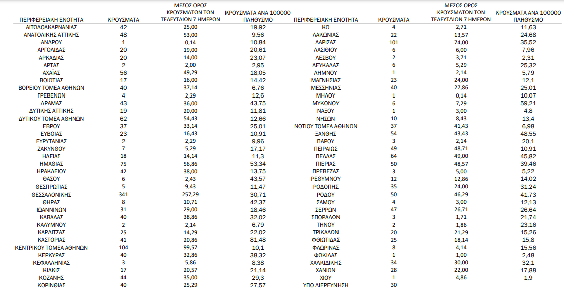 H γεωγραφική κατανομή των 2.126 κρουσμάτων.369 στην Αττική (ΠΙΝΑΚΑΣ)