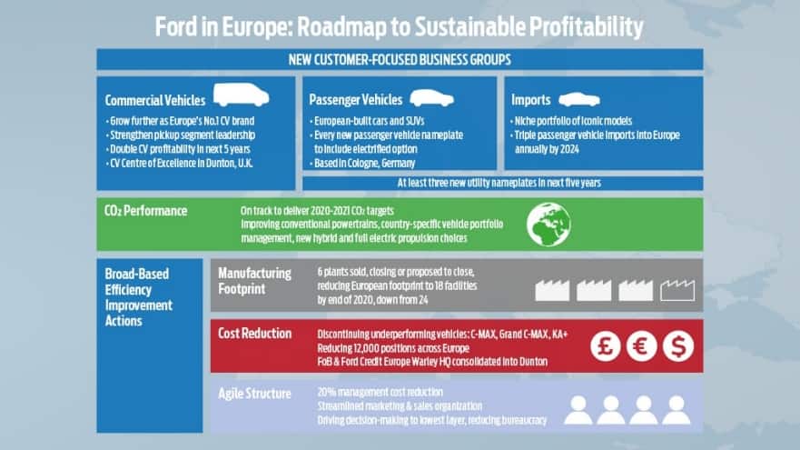 Επίσης, η Ford ανακοίνωσε ότι θα επεκτείνει τη σειρά των διαθέσιμων οχημάτων της στην Ευρώπη παρουσιάζοντας τουλάχιστον τρία νέα μοντέλα, συμπεριλαμβανομένου ενός ηλεκτροκίνητου SUV που θα βασίζεται στη Mustang