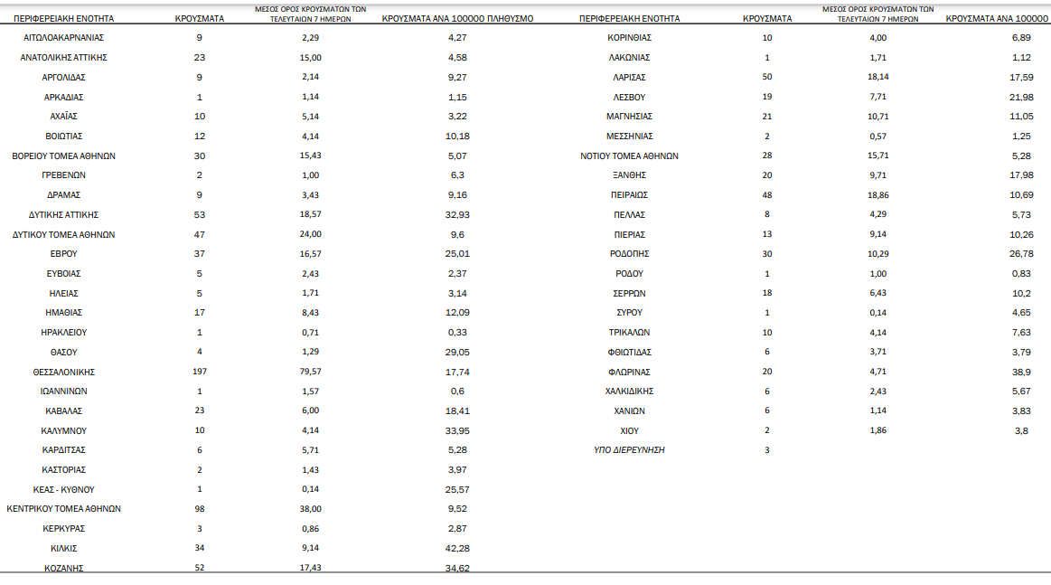 Η γεωγραφική κατανομή των 1047 κρουσμάτων.327 στην Αττική, 197 στη Θεσ/νίκη