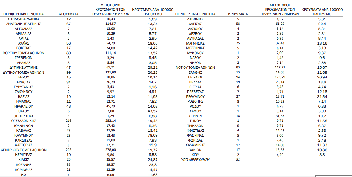 Η γεωγραφική κατανομή των 1607 κρουσμάτων. 675 στην Αττική (ΠΙΝΑΚΑΣ)