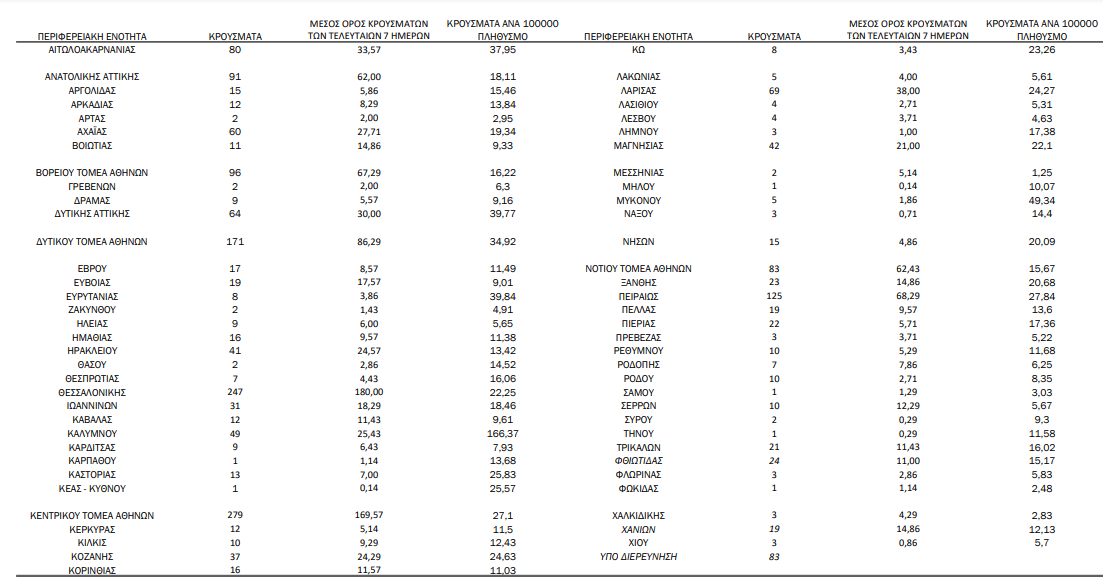 Η γεωγραφική κατανομή των 2.093 κρουσμάτων. 924 στην Αττική (ΠΙΝΑΚΑΣ)