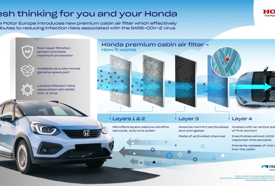 Το premium φίλτρο καμπίνας της Honda εξελίχθηκε σε συνεργασία με την Freudenberg και διατίθεται ως γνήσιο ανταλλακτικό της Honda, εναλλακτικά, αντί του στάνταρ φίλτρου καμπίνας της μάρκας. Το νέο φίλτρο αέρα παρέχει ενεργή προστασία, μειώνοντας δραστικά τη συγκέντρωση ιογενών αερολυμάτων. Αυτό επιτυγχάνεται μέσω μιας μοναδικής σχεδίασης πολλαπλών στρωμάτων που φιλτράρει, συγκρατεί και καταστρέφει επιβλαβή περιβαλλοντικά αέρια, ανόργανα και βιολογικά σωματίδια, αλλά και αερολύματα.