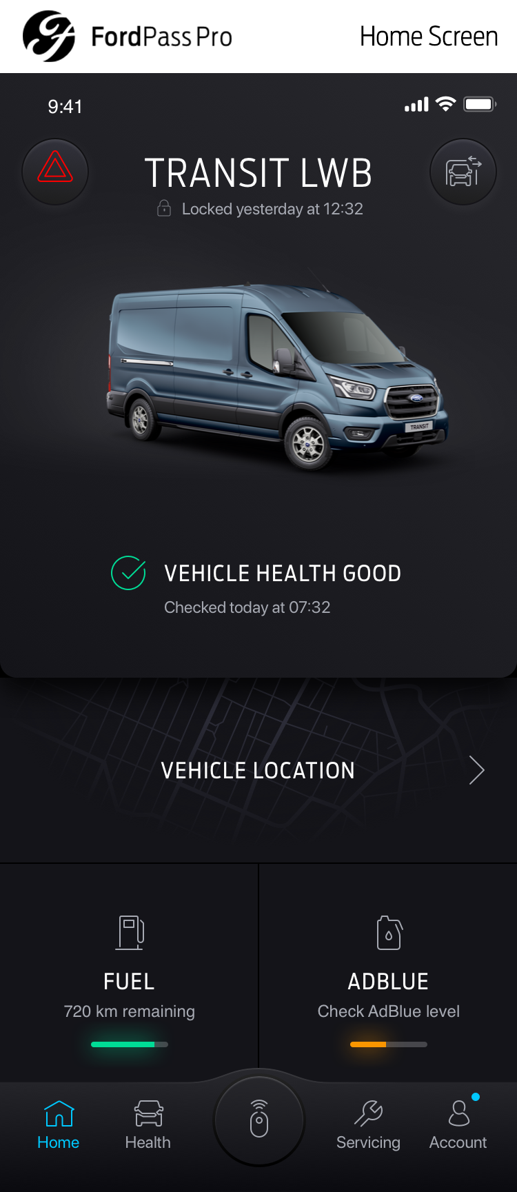 • Vehicle Location (Εντοπισμός Οχήματος): Η λειτουργία αυτή επιτρέπει στους ιδιοκτήτες να γνωρίζουν που βρίσκονται τα οχήματά τους στην αρχή ή στο τέλος της ημέρας, ενώ παράλληλα βοηθά τους οδηγούς να εντοπίζουν τα van τους σε πολυσύχναστους χώρους στάθμευσης ή εργοτάξια