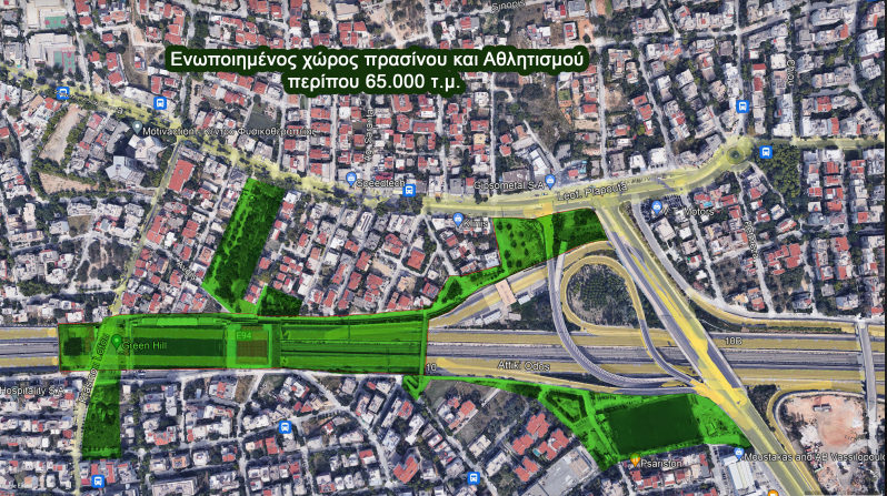 - Φωτογραφία από google Earth (σε pdf) με τον προτεινόμενο ενιαίο χώρο πρασίνου και αθλητισμού συνολικής έκτασης περίπου 65.000 τ.μ. !!!! (Η εμβαδομέτρηση έγινε με το google Earth pro).
