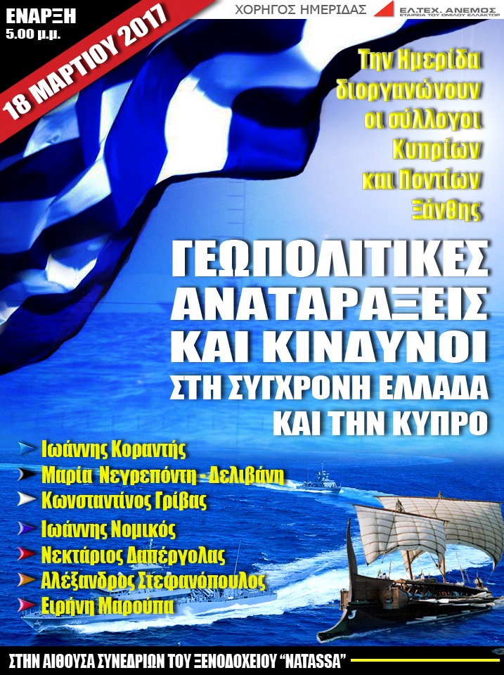 1Στην ακριτική γωνιά της Ελλάδας, στην στοχευμένη από «φίλους» και «εχθρούς», στον χώρο όπου ο νέο-οθωμανισμός του Ερντογάν ασκεί ισχυρές πιέσεις, ελέω της πάγιας αδιαφορίας των ελληνικών κυβερνήσεων, πρόκειται να υλοποιηθεί μια ιδιαιτέρως ενδιαφέρουσα ημερίδα γεωπολιτικής, με τίτλο «Γεωπολιτικές αναταράξεις και κίνδυνοι στη σύγχρονη Ελλάδα και την Κύπρο», την οποία διοργανώνουν οι ΣύλλογοιΚυπρίων και Ποντίων Ξάνθης.