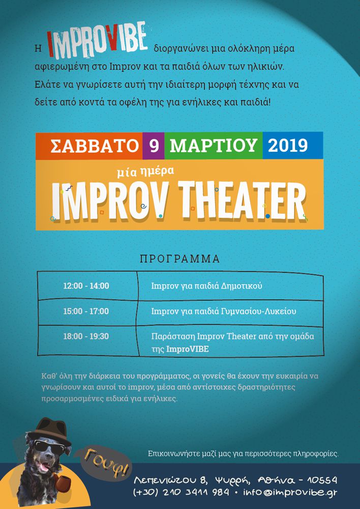 Το improv Theater είναι μια μορφή θεατρικής τέχνης όπου τα πάντα δημιουργούνται επί σκηνής. Δεν υπάρχει τίποτα προσχεδιασμένο και οι ηθοποιοί καλούνται να αυτοσχεδιάσουν, έχοντας, συνήθως, για έμπνευση μια πρόταση από το κοινό. Η ημέρα αυτή είναι μια ευκαιρία για τα παιδιά και τους γονείς να γνωρίσουν από κοντά τα οφέλη αυτής της ιδιαίτερης μορφής τέχνης.
