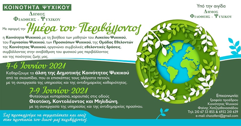 Με αφορμή την Ημέρα του Περιβάλλοντος, η Κοινότητα Ψυχικού, υπό την Αιγίδα του δήμου Φιλοθέης Ψυχικού, με τη βοήθεια των μαθητών του Λυκείου Ψυχικού, του Γυμνασίου Ψυχικού, των Προσκόπων Ψυχικού, της Ομάδας Εθελοντών της Κοινότητας Ψυχικού, οργανώνει συμβολικές εθελοντικές δράσεις, συμβάλλοντας στην αναβάθμιση του φυσικού μας περιβάλλοντος και της ποιότητας ζωής μας.