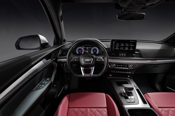 Στο εσωτερικό, το ανανεωμένο SQ5 TDI διατίθεται σε μαύρο ή σκούρο γκρι με φωτιζόμενα αλουμινένια κατώφλια στις πόρτες, με λογότυπα S. Τα ηλεκτρικά ρυθμιζόμενα σπορ καθίσματα με ανάγλυφα λογότυπα S διατίθενται σε μια επιλογή από τρεις παραλλαγές ταπετσαρίας. Ένας συνδυασμός δέρματος/συνθετικού δέρματος προσφέρεται στάνταρ, ενώ διατίθεται προαιρετικά ένας συνδυασμός δέρματος και Dinamica με ανάγλυφο S. Το νέο υλικό μικροϊνών Dinamica αποτελείται κυρίως από ανακυκλωμένο πλαστικό και αντικαθιστά την Alcantara.