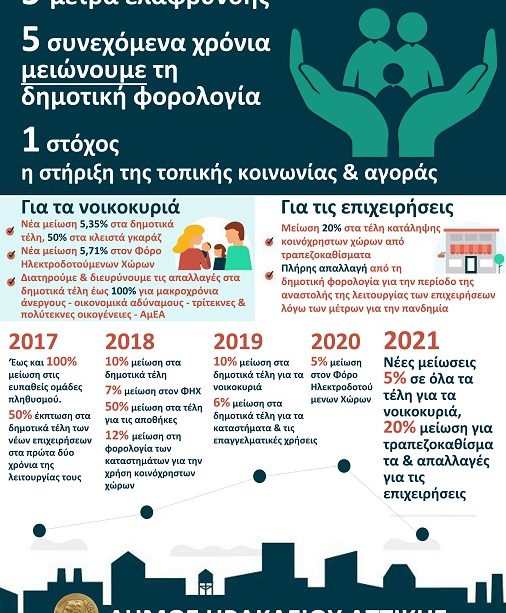 Με τις νέες, φετινές μειώσεις, η δημοτική αρχή συνεχίζει τη παράδοση των ελαφρύνσεων για τους κατοίκους και τους επαγγελματίες του Ηρακλείου, αθροιστικά τις μεγαλύτερες που έχουν γίνει ποτέ στην ιστορία του Δήμου.