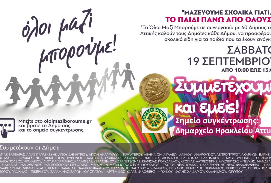 Ο Δήμος Ηρακλείου Αττικής και το Σώμα Εθελοντών του, ενώνουν τις δυνάμεις τους με 60 δήμους της Αττικής και συμμετέχουν στην δράση του «Όλοι Μαζί Μπορούμε» συγκεντρώνοντας σχολικά είδη για τα παιδιά των οικογενειών που το έχουν ανάγκη, το Σάββατο 19 Σεπτεμβρίου από τις 10.00 το πρωί έως τις 13.00 το μεσημέρι έξω από το δημαρχείο της πόλης (Στ. Καραγιώργη 2 & Μαρ. Αντύπα).