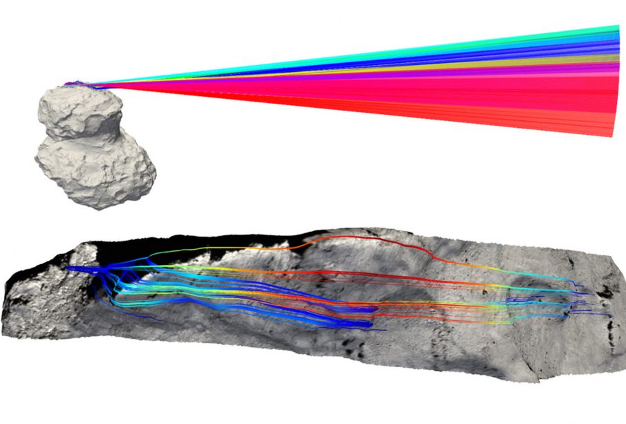 Η παρακάτω εικόνα δείχνει τα σήματα με μεγαλύτερη λεπτομέρεια, διαδίδοντας μέσα στον κομήτη από τον Philae στα σημεία από τα οποία αφήνουν τον κομήτη στον τροχιό. Η καμπύλη είναι αποτέλεσμα της προβολής των διαδρομών της στην ανώμαλη επιφάνεια του κομήτη.