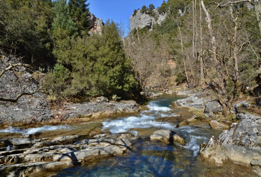 Στη συνέχεια, το μονοπάτι αρχίζει να ανεβαίνει ψηλότερα από την κοίτη και σιγά-σιγά απομακρύνεται απ’ αυτή. Διασχίζοντας ελατοσκέπαστες πλαγιές και λιβάδια υπο-αλπικού τύπου, μετά από 2 ώρες πορείας, η ομάδα θα φτάσει στην απείρου κάλλους τοποθεσία «Κράτια», στα 730 μέτρα υψόμετρο. Σήμα κατατεθέν της, η πετρόχτιστη πηγή και φυσικά ο τρίδυμος γιγαντιαίος πλάτανος που την σκιάζει. Κατόπιν, ακολουθώντας αριστερόστροφη πορεία θα καταλήξει σε δασικό δρόμο, ενώ υπάρχει και πέτρινο πεζούλι απ’ όπου κάποιος μπορεί να θαυμάσει τη θέα στον κάμπο.