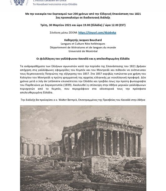 Οι Φιλέλληνες του γαλλόφωνου Καναδά και η απελευθερωμένη Ελλάδα – Διαδικτυακή διάλεξη του Καθ. Jacques Bouchard 31/3/21