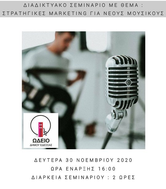 Θα πραγματοποιηθεί διαδικτυακό σεμινάριο στις 30 Νοεμβρίου 2020 και ώρα 16:00 σχετικά με στρατηγικές marketing που μπορούν να εφαρμόσουν οι μουσικοί για την προώθηση του έργου τους. Το ενημερωτικό σεμινάριο που διοργανώνει το ωδείο δήμου Έδεσσας με εισηγήτρια την καθηγήτρια του ωδείου κυρία  Μαρία Μπαλή, είναι δωρεάν για τους μαθητές και καθηγητές του ωδείου και θα λάβει χώρα μέσω της ηλεκτρονικής εφαρμογής “zoom”.