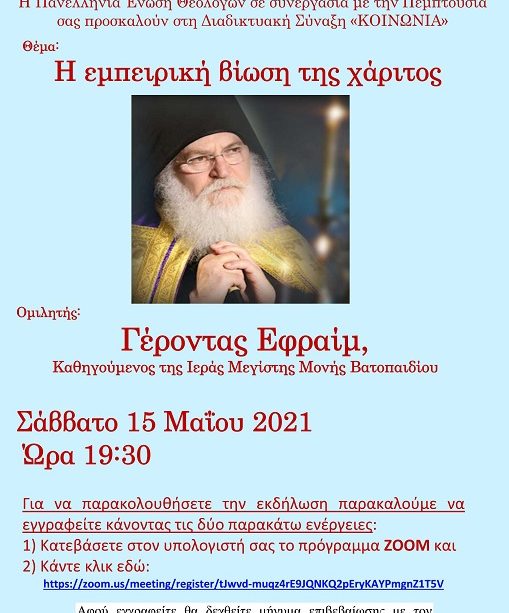 Πανελλήνια Ένωση Θεολόγων: Πρόσκληση στη διαδυκτιακή Σύναξη «ΚΟΙΝΩΝΙΑ» με ομιλητή τον Καθηγούμενο της Ι. Μ. Μονής Βατοπαιδίου, Γέροντα Εφραίμ