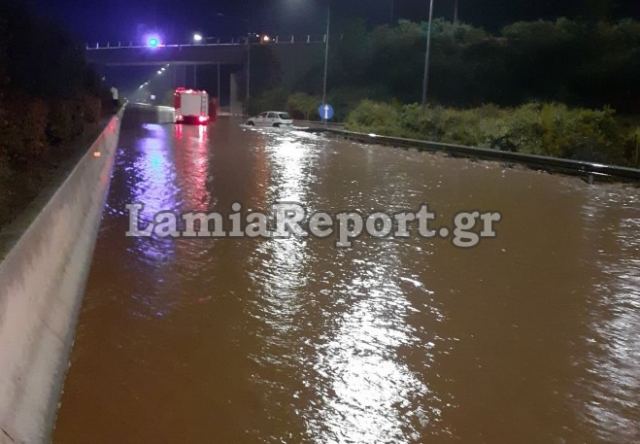 Συγκεκριμένα χείμαρρος πλημμύρισε το ένα ρεύμα κυκλοφορίας αυτό προς Λαμία με αποτέλεσμα να διακοπεί η κυκλοφορία και εκατοντάδες αυτοκίνητα να εγκλωβιστούν στην εθνική κάτω από σφοδρή βροχόπτωση.