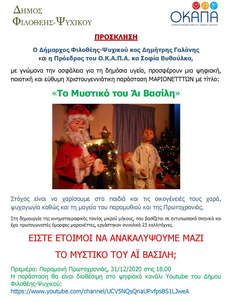 Με γνώμονα την ασφάλεια για τη δημόσια υγεία, ψηφιακά, μέσα στα σπίτια σας, ο Δήμος Φιλοθέης-Ψυχικού, δίνει στα παιδιά και τις οικογένειές τους, χαρά, ψυχαγωγία καθώς και τη μαγεία του παραμυθιού και της Πρωτοχρονιάς.