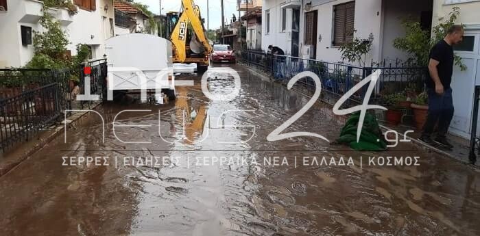 Με τις σκούπες στα χέρια, κάτοικοι σε διάφορες περιοχές της πόλης των Σερρών, προσπαθούν να διώξουν τα νερά.