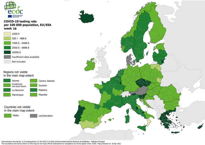 Στις χώρες με τα περισσότερα τεστ ανά 100.000 κατοίκους και με δείκτη θετικότητας κάτω του 4% και αυτήν την εβδομάδα η χώρα μας, σύμφωνα με τους έγχρωμους χάρτες του #ECDC που απεικονίζουν την επιδημιολογική εικόνα #COVID19 στα κράτη – μέλη της ΕΕ & EOX (Νορβηγία, Ισλανδία & Λιχτενστάιν) και οι οποίοι δημοσιεύτηκαν πριν από λίγο.