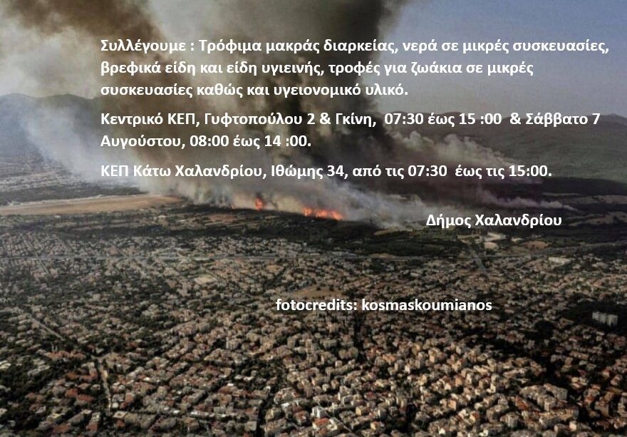 Ο Δήμος Χαλανδρίου καλεί τους κατοίκους και τους φορείς της πόλης μας να συνδράμουν στην προσπάθεια συγκέντρωσης βοήθειας για τους πληγέντες από τις καταστροφικές πυρκαγιές στην Αττική.