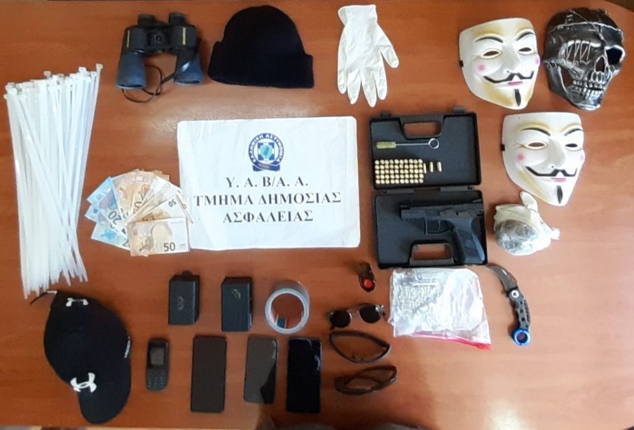 Σε έρευνες στις κατοικίες των συλληφθέντων και σε οχήματα, βρέθηκαν και κατασχέθηκαν μεταξύ άλλων αεροβόλο πιστόλι με πλήθος από φυσίγγια κρότου, αμπούλες και πλαστικά σφαιρίδια, σιδερογροθιά με ενσωματωμένο μαχαίρι, σπρέι πιπεριού, ποσότητα ακατέργαστης κάνναβης συνολικού βάρους -103- γραμμαρίων, ρουχισμός, κινητά τηλέφωνα, πλήθος πλαστικών δεματικών (tie wrap) και μάσκες.