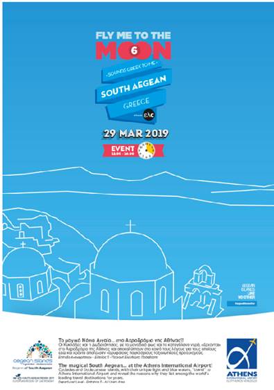 Το Νότιο Αιγαίο και τα νησιά του είναι ο έκτος προορισμός του προγράμματος Fly me to the Moon-Sounds Greek to Me! Οι Κυκλάδες και η Δωδεκάνησος παίρνουν τη σκυτάλη στο αεροδρόμιο, για μια ημέρα αφιερωμένη στις παραδόσεις τους. Ταξιδιώτες και επισκέπτες που θα βρεθούν στον Διεθνή Αερολιμένα Αθηνών την Παρασκευή, 29 Μαρτίου, θα απολαύσουν νησιώτικα ακούσματα και χορούς, θα γνωρίσουν την τέχνη μαρμαροτεχνίας της Τήνου και θα γευτούν την αιγαιοπελαγίτικη κουζίνα.