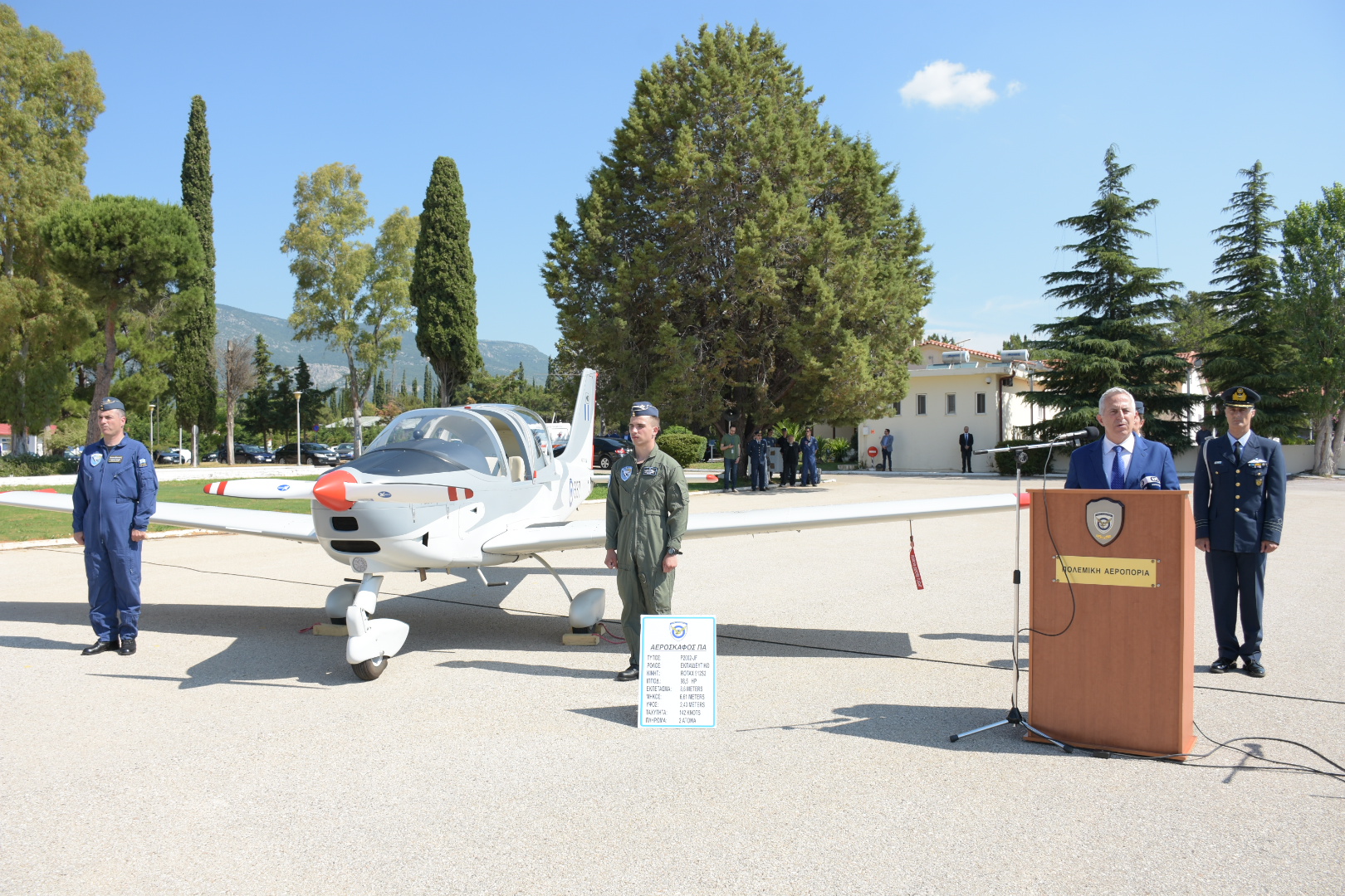 Σήμερα, είμαστε στην ευχάριστη θέση να αντικρίζουμε τους καρπούς μιας σημαντικής προσπάθειας, την υλοποίηση ενός προγράμματος με σκοπό την αναβάθμιση της πτητικής εκπαίδευσης που πραγματοποιείται στη Σχολή Ικάρων, στο λίκνο της Ελληνικής Πολεμικής Αεροπορίας. Η ένταξη των δώδεκα νέων αεροσκαφών με τον συναφή επίγειο εξοπλισμό υποστήριξης και εκπαίδευσης, αποτελεί ένα έμπρακτο και ουσιαστικό βήμα, που εντάσσεται στον ευρύτερο σχεδιασμό των Ενόπλων Δυνάμεων για το σύνολο της αεροπορικής εκπαίδευσης.