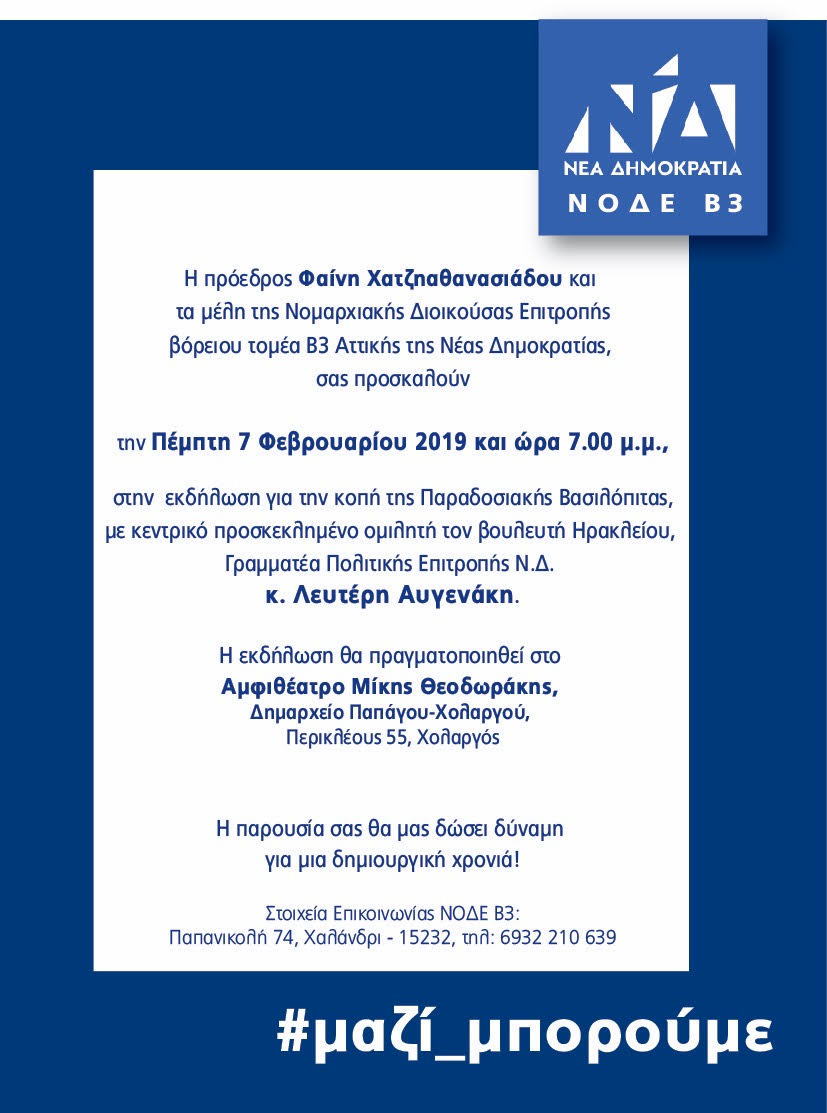unnamedΗ πρόεδρος Φαίνη Χατζηαθανασιάδου και τα μέλη της Νομαρχιακής Διοικούσας Επιτροπής βόρειου τομέα Β3 Αττικής της Νέας Δημοκρατίας, σας προσκαλούν,  την Πέμπτη 7 Φεβρουαρίου 2019 και ώρα 7.00 μ.μ., στην  εκδήλωση για την κοπή της Παραδοσιακής Βασιλόπιτας, με κεντρικό προσκεκλημένο ομιλητή, τον βουλευτή Ηρακλείου, Γραμματέα Πολιτικής Επιτροπής Ν.Δ. κ. Λευτέρη Αυγενάκη.