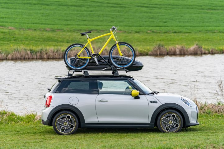 Καθώς η φιλοσοφία δημιουργικής χρήσης χώρου που χαρακτηρίζει τη μάρκα ισχύει και για την οροφή του MINI Cooper SE, υπάρχει χώρος ακόμα και για ένα ποδήλατο δίπλα στη μπαγκαζιέρα. Με τη βάση ποδηλάτου touring που επίσης περιλαμβάνεται στη συλλογή Γνήσιων Αξεσουάρ MINI, δίτροχα διαφορετικών τύπων και διαστάσεων μπορούν να τοποθετούνται κάθετα και με ασφάλεια στο σύστημα ραγών. Η βάση από αλουμίνιο υψηλής αντοχής σταθεροποιεί το ποδήλατο με ένα σύστημα ασφάλισης με κλειδαριά και δύο ιμάντες συγκράτησης. Επιπλέον, η γκάμα περιλαμβάνει και άλλες λύσεις μεταφοράς όπως σχάρες σκι και ένα αλουμινένιο καλάθι αποσκευών που είναι συμβατό με το σύστημα ραγών.