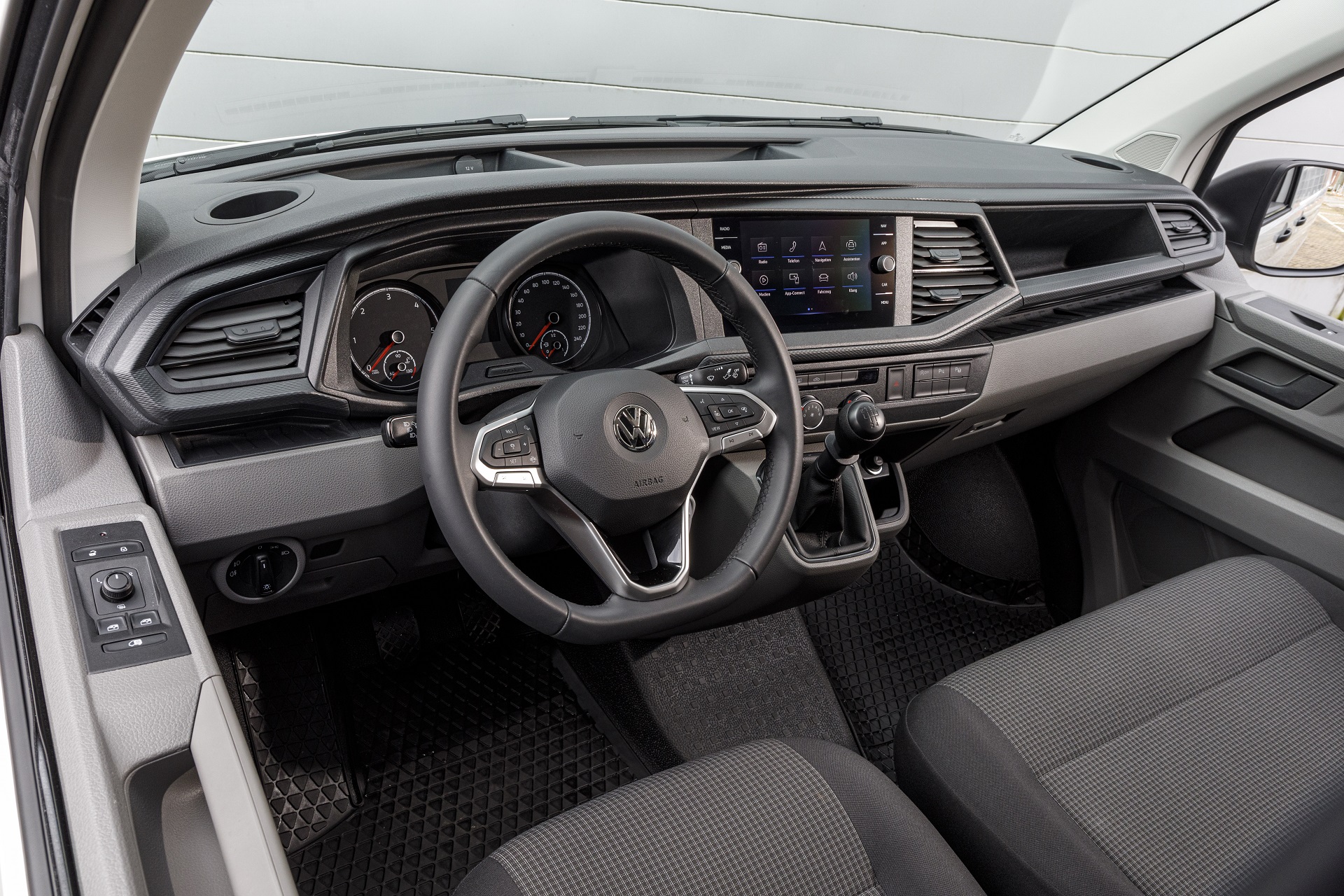 Επίσης, νέας σχεδίασης είναι οι ποτηροθήκες που βρίσκονται κοντά στις εμπρός κολόνες, καθώς και η μεγαλύτερη θέση με προαιρετική επαγωγική φόρτιση για smartphone. Το τιμόνι έχει επίσης επανασχεδιαστεί. Στο νέο τιμόνι πολλαπλών λειτουργιών υπάρχει τώρα ένας διακόπτης View, ο οποίος με ένα μόνο κλικ δίνει τη δυνατότητα εναλλαγής των θεματικών ενοτήτων του ψηφιακού πίνακα οργάνων (Digital Cockpit). Παράλληλα, το νέο Transporter διαθέτει νέας σχεδίασης εσωτερικό θυρών, εσωτερικά φώτα τεχνολογίας LED αλλά και νέες επενδύσεις καθισμάτων.