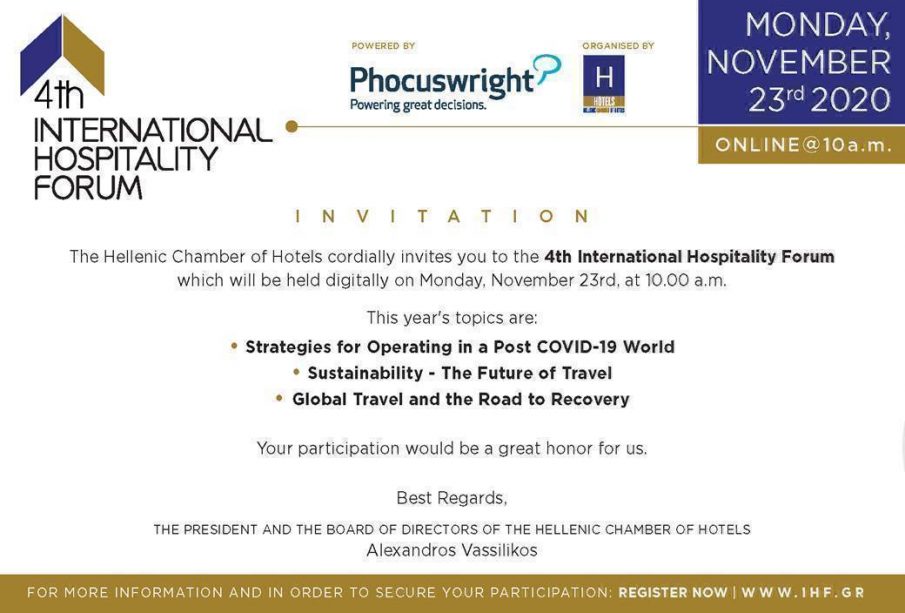 Το 4ο Διεθνές Φόρουμ Φιλοξενίας (4th International Hospitality Forum) που διοργανώνει το Ξενοδοχειακό Επιμελητήριο της Ελλάδος με τη συνεργασία της Phocuswright, θα πραγματοποιηθεί την προσεχή Δευτέρα 23 Νοεμβρίου στις 10.00 π.μ, μέσω της διαδικτυακής πλατφόρμας Swapcard.