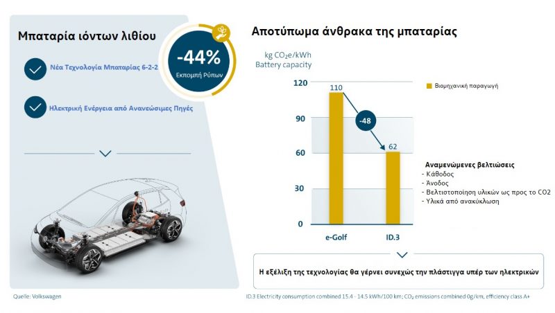 Σε σύγκριση με την μπαταρία που χρησιμοποιείται στο eGolf, η νέα γενιά μπαταριών στο ID.3, σηματοδοτεί μια τεράστια πρόοδο. Με το νέο υλικό καθόδου, NCM 6-2-2, η χωρητικότητα της μπαταρίας έχει αυξηθεί με το ίδιο κόστος υλικού σε σύγκριση με την προηγούμενη γενιά (1-1-1). Ταυτόχρονα, ο προμηθευτής της μπαταρίας πλέον χρησιμοποιεί ηλεκτρική ενέργεια από ανανεώσιμες πηγές. Αυτά τα δύο μέτρα μείωσαν το ειδικό αποτύπωμα άνθρακα από 110 κιλά CO2 / kWh σε μόλις 62 κιλά CO2 / kWh (Γράφημα 3).