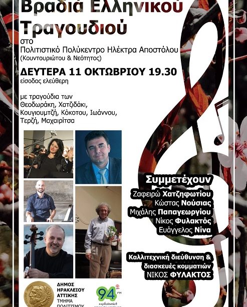 Βραδιά ελληνικού τραγουδιού στο Δήμο Ηρακλείου Αττικής: Δευτέρα 11/10 19.30 Πολιτιστικό Πολύκεντρο με ελεύθερη είσοδο